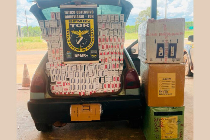 Durante a abordagem, os policiais constataram que o veículo transportava diversos pacotes de cigarros, além de caixas contendo perfumes e óculos, todos de origem estrangeira.