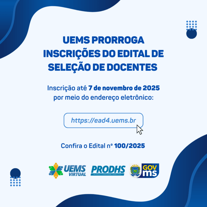 A Universidade Estadual de Mato Grosso do Sul (UEMS), por meio da Pró-Reitoria de Desenvolvimento Humano e Social (PRODHS) e da Pró-Reitoria de Ensino (PROE), informa que o prazo de inscrições do Edital de Seleção de Docentes nº 100/2025 foi prorrogado. Os interessados têm até o dia 7 de novembro de 2025, às 13h (horário de Mato Grosso do Sul), para efetuar a inscrição de forma exclusivamente online, por meio do endereço eletrônico http://ead4.uems.br.