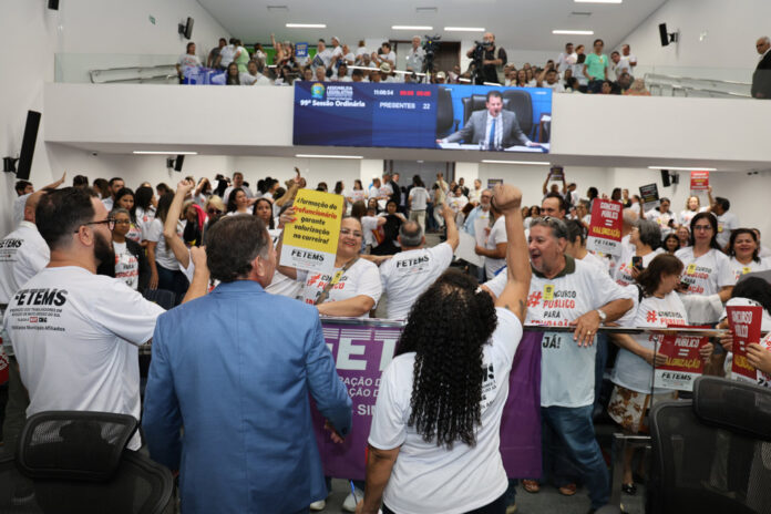 Na Assembleia Legislativa, a categoria ocupou o plenário com cerca de 600 professoras, professores, administrativas e administrativos, em um ato que simbolizou a força e a união da Educação pública sul-mato-grossense. A presidenta da FETEMS, Deumeires Morais, fez uso da tribuna para apresentar as reivindicações da categoria e conclamar os deputados e deputadas a se somarem à luta pela valorização dos profissionais da Educação.