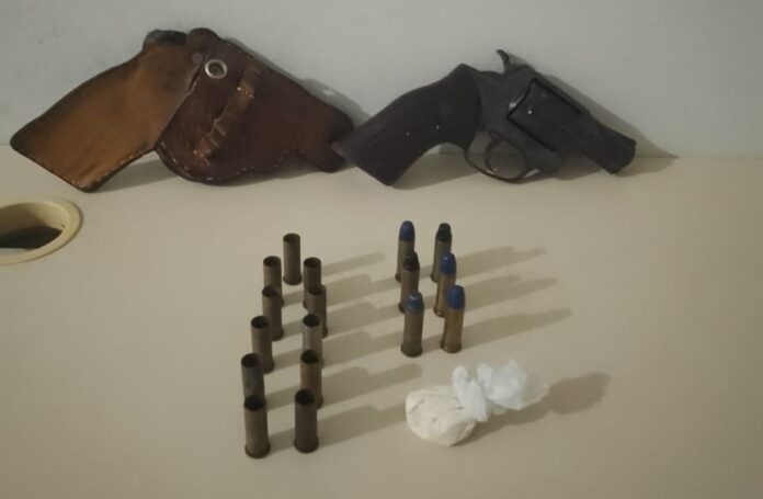 De posse das informações, os policiais realizaram buscas na residência do casal, onde encontraram munições de arma de fogo, calibre: .38, sendo duas munições intactas, 11 deflagradas, e em vistoria no interior do veículo ainda localizaram a arma de fogo, marca Rossi; tipo revólver, calibre .38, municiado com quatro munições intactas e um ‘pacote’ contendo cocaína.