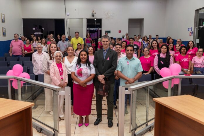 A campanha “Outubro Rosa” é celebrada anualmente no mundo todo com o objetivo de compartilhar informações e promover a conscientização sobre o câncer de mama. E foi com esse tema que a Câmara sediou uma palestra nesta quarta-feira (01), por meio de uma propositura da vereadora Sirlene dos Santos. Na mesa de autoridades, a senhora Ondina Fernandes de Almeida, presidente da Rede Feminina de Combate ao Câncer (RFCC), Juliana Salim, secretária municipal de Saúde Pública, e o vereador Davis Martinelli.