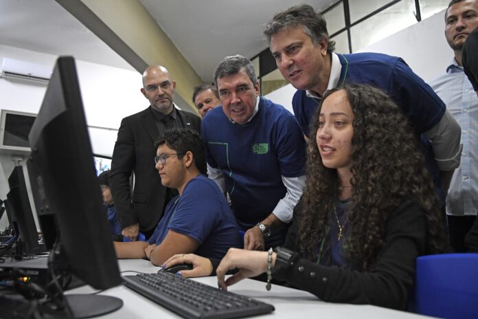 O governador Eduardo Riedel mostrou para o ministro da Educação, Camilo Santana, o trabalho desenvolvido na Escola Estadual Lúcia Martins Coelho – que fica no centro de Campo Grande –, que atende 360 estudantes do Ensino Médio.