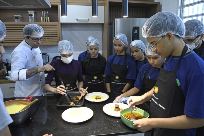Os alunos do 1° e 2° ano do Ensino Médio desfrutam de um ambiente preparado para receber aulas teóricas e práticas de gastronomia. Aprendem pratos regionais, nacionais e internacionais. Cada aula tem 50 minutos e os jovens colocam a mão na massa. Os pratos inclusive são avaliados no estilo “Master Chef” pelos professores.