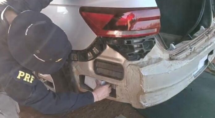 Após fiscalização no veículo, os policiais encontraram vários celulares escondidos em um compartimento oculto.