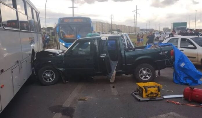 A perseguição chegou ao fim no balão da DF-001, entre Riacho Fundo e Recanto das Emas, quando a caminhonete colidiu frontalmente com um ônibus.