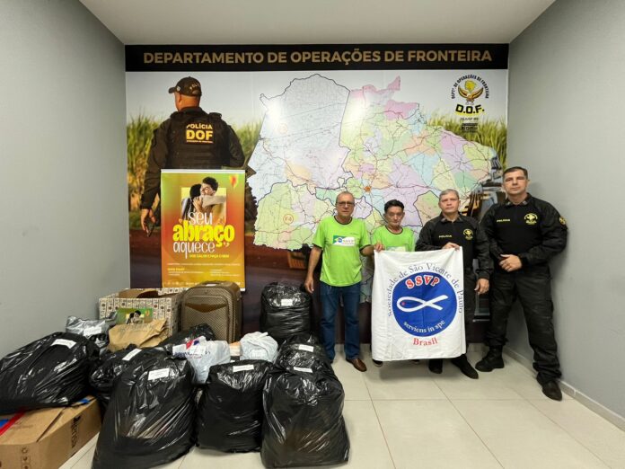 O diretor do DOF (Departamento de Operações de Fronteira), tenente-coronel Wilmar Fernandes, entregou na manhã desta sexta-feira (17), aproximadamente 600 peças de roupas e calçados ao movimento Vicentinos, da paróquia São João Batista, do Jardim Água Boa em Dourados. As peças foram arrecadadas dentro da campanha “Seu Abraço Aquece – Doe calor e faça o bem”.
