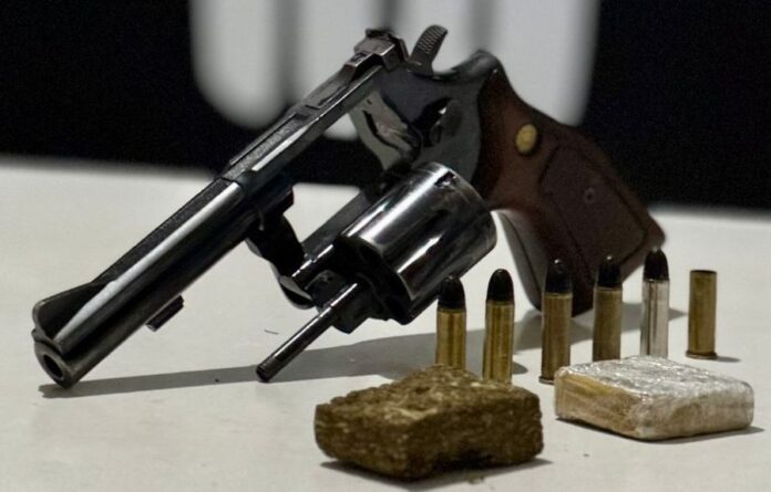 No local, os policiais encontraram um revólver calibre .38 com cinco munições intactas e uma deflagrada. Durante a revista pessoal, também foram localizadas porções de maconha, totalizando aproximadamente 47 gramas.