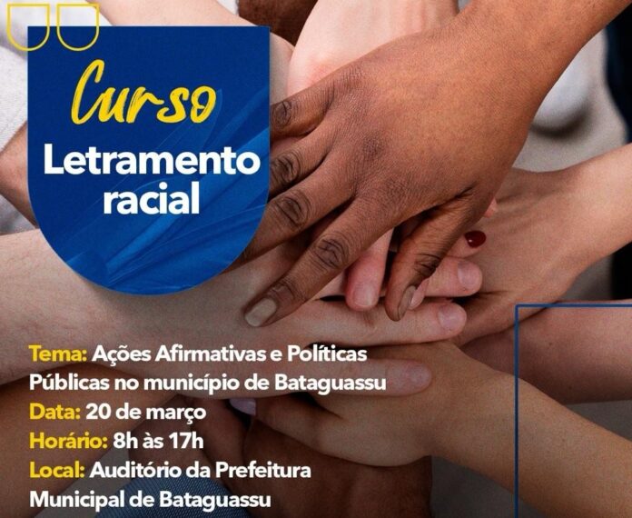 A Prefeitura de Bataguassu, através da Secretaria Municipal de Assistência Social, por meio da Coordenadoria Municipal de Igualdade Racial promove no dia 20 de março, quarta-feira, o Curso Letramento Racial. A atividade será realizada das 8 às 17 horas (horário de Brasília), no Anfiteatro da Prefeitura.