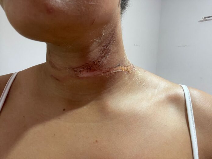 A vítima contou que retornava da academia quando passou pelo local sem perceber a fiação caída. Ao atravessar a rua, os fios se enroscaram na motocicleta, nas pernas e no pescoço, provocando sua queda. Populares que estavam próximos ainda tentaram alertá-la, mas o acidente já havia ocorrido.